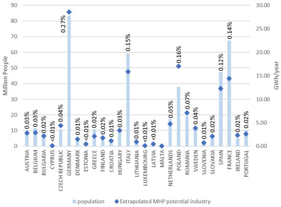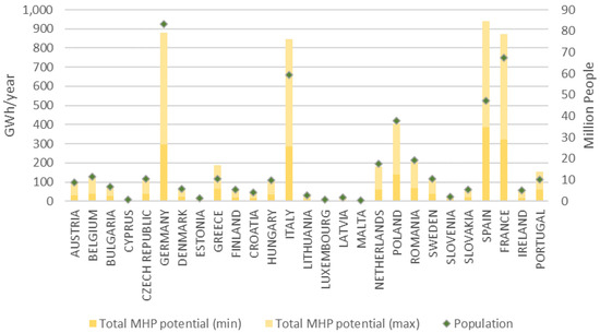 Range of total extrapolated energy recovery potential through MHP and corresponding population for the different EU-27 countries.