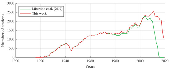 The rainfall data used in this paper come from the Improved Italian-Rainfall Extreme Dataset (I2-RED). It represents an updated and quality-controlled version of the dataset [2] used in [3]. The increase in the number of stations is reported in Figure 1: the new database presents a significant improvement in terms of data availability, especially from 2005 onward.