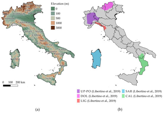 Elevation data from NASA Shuttle Radar Topography Mission (SRTM) Digital Elevation Model (DEM) of Italy (m a.s.l.) with the boundaries of the 20 administrative Italian regions (a). Geographic extent of the 5 pilot cases used in [3] (b).