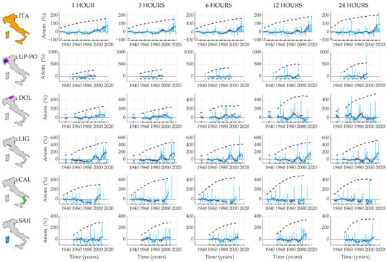 Record-breaking analysis. Each row refers to a different region (ITA, UP-PO, DOL, LIG, CAL and SAR) while each column presents a different duration (1, 3, 6, 12 and 24 h). Light blue bars represent the annual RB anomalies and the blue line represents the long-term RB anomalies (obtained by smoothing using a 10-year moving average filter the annual RB anomalies). For comparison purposes, we inserted in red the long-term RB anomalies obtained in [3]. The 95% confidence interval for the iid model are also included (black dashed lines).