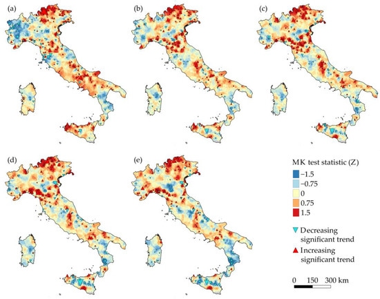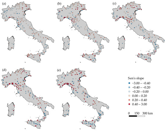 In Figure 4 we report the results obtained with the Mann-Kendall test while in Figure 5 we insert the Sen’s slope estimates.
