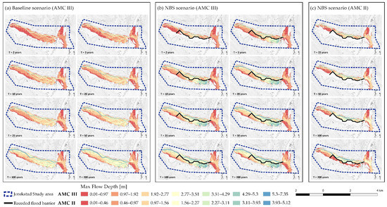 Maximum flow depth maps for different scenarios: (a) baseline scenario considering AMC III; (b) NBS scenario considering AMC III; (c) NBS scenario considering AMC II.