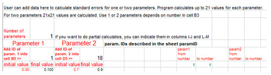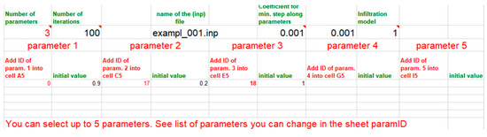 In Visual Basic for Applications (VBA), two options for automatic calibration were created: Option A for calibrating one or two parameters using the trial-and-error approach and Option B for calibrating up to five parameters at the same time using the Levenberg–Marquardt algorithm. An informative worksheet (“paramID”) is dedicated for the parameters, which may be included in the automatic model calibration. Each parameter is equipped with an ID, description, and minimal and maximal values, which may be defined by the user. Table 1 lists all of the parameters that can be calibrated with the developed tool.