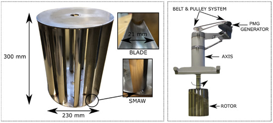 The elements used to carry out the tests were a vertical axis turbine, a hydrodynamic water tunnel, a baffle plate, and a control system. The turbine is made up of 12 semicircular stainless-steel blades, 0.3 m high and 0.23 m wide (Figure 1). The blades have an angular separation of 30° with a semicircular section of 21 mm in diameter. At the top of the shaft is a system of belts and pulleys designed to multiply the speed of rotation mechanically connected to a permanent magnet generator (PMG).