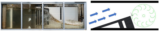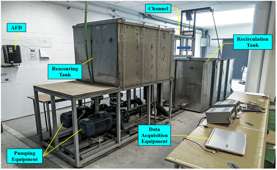 The experimental tests were carried out in a hydrodynamic water tunnel (HWT) (Figure 2) made up of tanks (reassuring and recirculation), hydraulic pumps, adjustable frequency drive (AFD), glass channel (0.5 m height, 0.3 m width and 1.5 length) and a monitoring–control system. This system, called TURbine Test Laboratory Equipment, TURTLE, is made up of ultrasonic water height sensors, an electronic board and a PC, which together with specially designed software allow the test to be carried out and the data obtained to be collected.