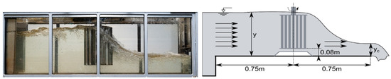 The tests were carried out with two flow rates: 0.055 m3/s (Q1) and 0.064 m3/s (Q2). First, the channel was tested without modifying its geometry (scenario 1) (Figure 3), and then, the baffle was added (scenario 2) (Figure 4).