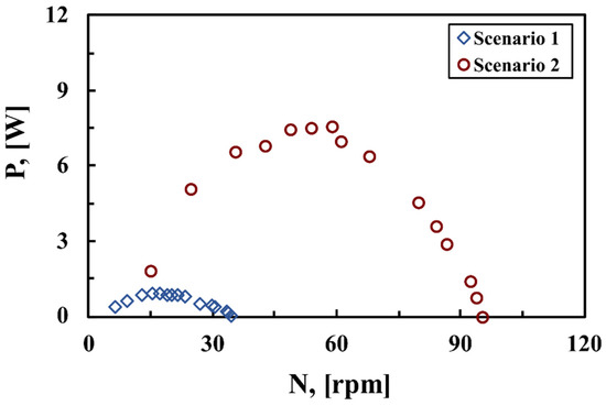 The experimental and numerical results of N (rpm) and power (W) for the two flow rates tested were analyzed for Q1 (Figure 10) and Q2 (Figure 11).