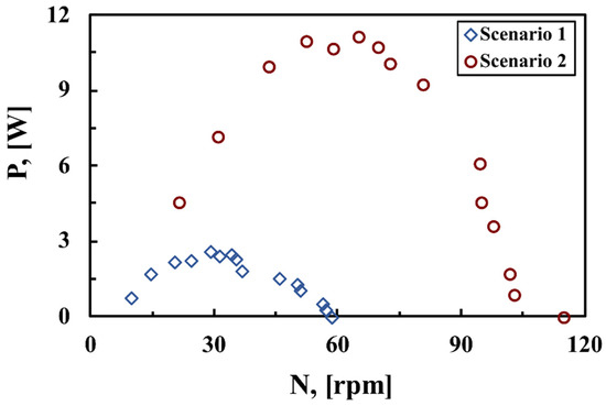 The numerical model was validated with the experimental model (scenario 2) by comparing its degree of similarity between the results of the rotational speed (N) and power characteristics, and the positions of the free surfaces.