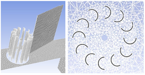 To obtain the numerical CFD model, a grid of cells was prepared where the flow equations were solved. To solve the rotation of the turbine, the geometry was divided into eight different volumes in which an unstructured mesh based on tetrahedrons was used to achieve a good adaptation to the complex areas, except in the water discharge area where a structured mesh based on rectangular prisms was used due to its simple cubic shape. A cylindrical volume was incorporated that helped to simulate the movement of the turbine with a good degree of precision (Figure 8), as the unstructured mesh adapts perfectly to the turbine blades. The number of grid cells was set at 1,200,000 with satisfactory quality: 99.99% of the cells had an asymmetry value of less than 0.7. To study the dependence of the grid on the power results and its influence on the calculation time, four numbers of cells were evaluated: 200,000, 500,000, 800,000, 1,200,000, and 1,500,000 with the same flow rate and the range of rotational speeds that define the turbine power characteristics. With 1,200,000 cells, the ideal compromise between accuracy and calculation time was achieved.