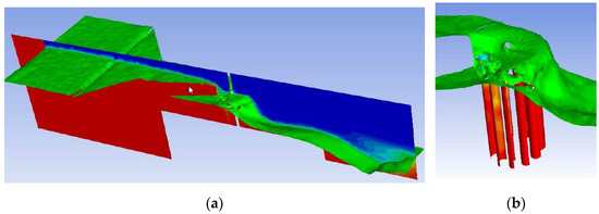 The volume of fluid (VOF) model was selected to resolve the behavior of the free surface at its boundary between air and water (Figure 9). The model solved the unsteady Reynolds-average Navier–Stokes (URANS) for each cell included in the domain. The boundary conditions applied were mass flow at the water inlets, pressure outlet at the discharge, and the upper part of the model (tank and channel) with normal atmospheric pressure (101,325 Pa). The surfaces of the tank, the channel, and the turbine blades were defined as walls with a no-slip condition. Water and air densities and viscosities were set to constant values (water: 1.025 Kg/m3 and 1.003 × 10−3 Kg/m·s; air: 1.225 Kg/m3 and 1.789 × 10−5 Kg/m·s). To solve the URANS equations, the pressure-implicit solver algorithm with splitting of operators was used. In addition, second-order schemes were applied for the discretization of the spatial and temporal derivatives in the equations. The semi-implicit method for pressure-bound equations (SIMPLE) was used to solve the velocity–pressure coupling and turbulence was simulated using the shear stress transport (SST) k-ω turbulence model, suitable for complex flows. ANSYS FLUENT V18.0 software was used to perform the simulations of the numerical model [15].