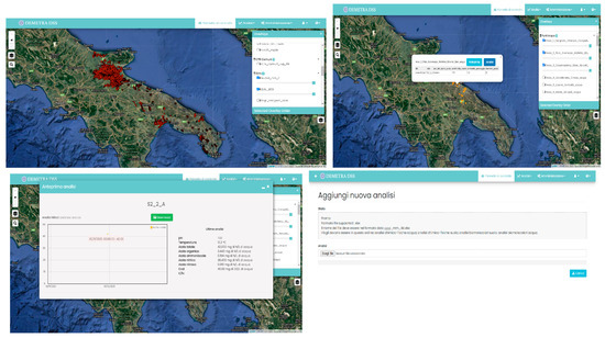 From an infrastructural point of view, therefore, the D-DSS consists of three different elements: (i) a database, for storing and historicizing the loaded data; (ii) a map server, for the publication of information layers and the display of user services (WMS); (iii) a client frontend program, accessible from common Internet browsers, which allows the operator to interact with all the system’s features.
