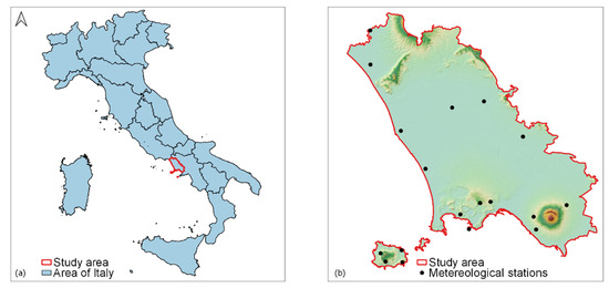 The study area is the western part of the Campania Region, located in southern Italy (Figure 1a). It has an area of 1619 km2 and is characterized by a rain gauge density of 0.01 station/km2 (Figure 1b).