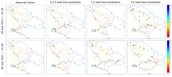 The results of the events are presented in terms of the rainfall pattern in two control instants: 28 July 2011—14:30 and 14:40 (Figure 2).