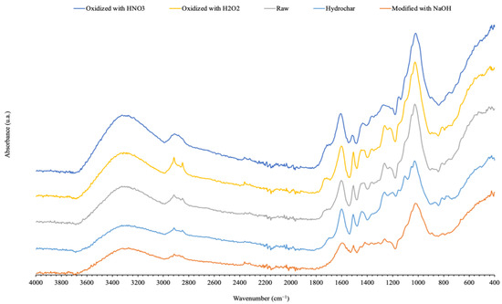 The ATR-FTIR spectra of the biosorbents were recorded in the region of 400–4000 cm−1 and are shown in Figure 1. FTIR measurements revealed the availability of functional groups on the cell walls of Pinus pinaster in relation to the performed chemical and treatment processes. The FTIR spectra of the original samples is described in a previous work of this research group [10]. All samples exhibit a vibration at 1600 cm−1 that can be assigned to an aromatic ring stretching mode, representative of the aromatic nature of the samples. The FTIR spectra of the sample oxidized with H2O2 did not show relevant differences in terms of functional groups compared to the raw material. The raw pine presents bands at 2910 and 2844 cm−1 due to asymmetric and symmetric C–H stretching vibrations in the aliphatic chains –CH, –CH2 and –CH3. The oxidized pine with HNO3 does not reveal the existence of these bands. In the alkali-modified pine, the carbonyl group (band at 1700 cm−1) is not so evident as in the other samples. Pine hydrochar retained considerable oxygen-containing functional groups after hydrothermal treatment. Peaks between 3200 and 3600 cm−1 correlated with O–H stretching of hydrogen-bonded hydroxyl groups and were still evident in the hydrochar compared to raw pine bark. The peak at approximately 2906 cm−1, which can be explained as –C–H stretching of the methylene groups, is present [18]. Peaks about 1100 and 1200 cm−1 appear in the hydrochar and not in the raw biomass. The peaks at ∼1100 and 1200 cm−1 correspond to C–O stretching and O–H bending modes of alcoholic, phenolic and carboxylic groups [19]. The bands at 1719 cm−1 can be assigned to the C=O stretching vibration from ketone, aldehyde or carboxyl groups. However, this band is not so evident on hydrochar (the carboxylic acid groups are thus not so predominant in this biosorbent).