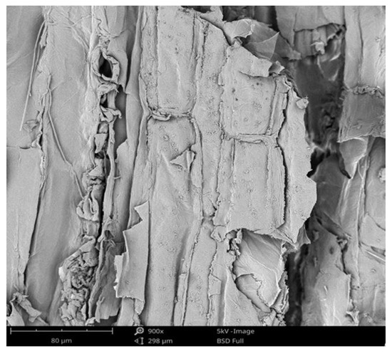 SEM has been used as a primary tool to characterize the surface morphology and the essential physical properties of the adsorbents, such as porosity and structure. Figure 2 shows a radial view of a ray of Pinus pinaster bark constituted of small pits. Pine bark presents a very low specific surface area (<4 m2/g [17]).
