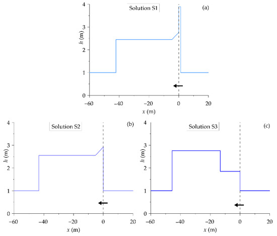 The following is considered the example where the states and the porosities in Equation (4) are , , , and . These initial conditions characterize a right supercritical flow that impacts on a porosity reduction and satisfies the condition of Equation (7). Supercritical flow conditions are also initially present to the left. The corresponding Riemann problem admits three different exact solutions (named S1, S2, and S3, respectively) that are plotted in Figure 1 (flow depth at time t = 5 s), where an arrow represents the flow direction through the porosity discontinuity.