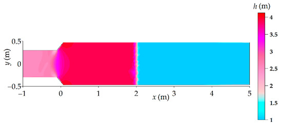 The approximate solution of the example Riemann problem contained in Section 2.3 is tackled with the 2-d SWE numerical model described in [13] that considers a channel with length L = 200 m. The channel consists of a left reach, whose width is BL = 0.6 m, and a right reach, whose width is BR = 1 m (see Figure 2). A linear contraction, located at the center of the channel (where x = 0 m), connects the right reach to the left one by means of two straight walls that are inclined by 45° with respect to the street axis. The linear contraction, which is Lc = 0.20 m long, is sufficiently short with respect to the total length to be considered a true geometric discontinuity. A non-uniform unstructured triangular mesh is used, with an average size Δs = 0.50 m at the channel ends and Δs = 0.05 m in the vicinity of the contraction. All of the channel boundaries are free-slip walls, except for the left and right sides, which are open ends, and the initial conditions coincide with those of the 1-d model. The plane view of the flow depth around x = 0 is represented in Figure 2 at time t = 5 s.