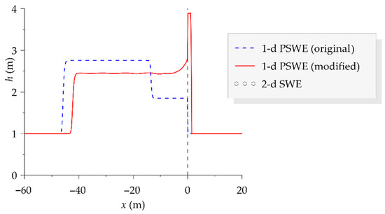 More details about the treatment of variable reconstruction at interfaces when the energy available is not sufficient are reported in [3]. The solution of Equation (1) with the initial conditions described in Section 2.3 is approximated with the scheme by [3] using Δx = 0.20 m and Δt = 0.005 s. The corresponding numerical results (flow depth h) at time t = 5 s are plotted in Figure 3 with a dashed line.