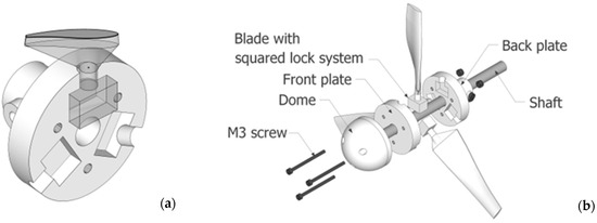 The whole prototype was drawn in the SOLIDWORKS 2019 software with the purpose of realizing a flexible prototype able to be modified potentially, creating a special squared lock system for the blade into the hub. The adaptation draws inspiration from similar research [15] with a different scope, which is equally applicable to the present study. Figure 3a shows the geometric characteristic of the studied joint, which was graphically realized by a revolution solid that follows the airfoil. The total dimension of the rotor is the sum of the blade radius of 0.084 m, the hub radius 0.025 m, and the height of the joint of 0.009 m, making the turbine radius equal to 0.118 m. A sort of pillar with a squared ending acts as a joint between the extremities of the two plates. The designed turbine was printed with a 3D printer in polylactic acid, also known as PLA, and was composed of six pieces attached to each other by three M3 screws. Figure 3b is the CAD project showing each rotor part in detail.