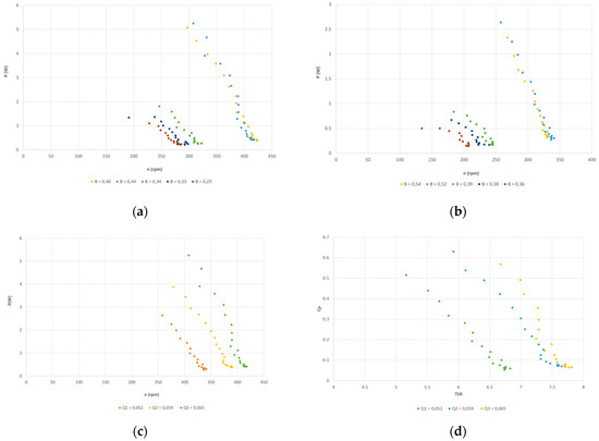 For each upstream velocity V1, the maximum rotational speed corresponds to the zero-load condition (0V in the brake). On the other hand, with the increase in the turbine load, the rotational speed decreases, which also produces an increase in the angle between the flow and the blades so that an increase in power and in the lift is produced up to a certain value, after which the airfoil reaches the stall condition and the drag forces increase more rapidly than the lift one. This phenomenon produces a decrease in power and rotational speed up to the complete turbine arresting. Therefore, the experimental points are located in the unstable part of the curve (on the left side), which is not visible in Figure 5 because they are beyond the recording experimental data point. The comparison between Test 1 and 3 shown in the P-n charts (a) and (b) of Figure 5 reveals how the power output variation increases with the upstream flow velocity and blockage ratio. However, it is evident how, in correspondence with the highest value of blockage ratio produced in the channel, 0.46 in Test 1 and 0.54 in Test 3, it determines a decrease in power extracted. Moreover, Figure 5 (c) and (d) show the start with the lowest flow rate Q1, which corresponds to an upstream velocity equal to 0.62 m/s and a Cp maximum equal to 0.52 for a TSR of 5.16; this coincides with the fully filled channel condition where the blockage ratio (At/AC) is minimal, B = 0.52. The peak of the power coefficient reaches its maximum value of 0.62 at a TSR of 5.91 with a corresponding velocity of 0.63 m/s and B = 0.47 in the Q2 flow rate condition. On the contrary, with the Q3 and an upstream velocity of 0.66 m/s, it produces a reduction in Cp, equal to 0.56 because, in this case, the channel gate is fully opened with a critical outlet flow condition. Therefore, the blockage ratio positively affects the turbine performance, because it compresses the flow and produces an increase in the power coefficient. Still, it could also determine a decrease in Cp due to the interference between water and air when the gate is nearly open. What happens is that the water level on the upstream side is nearly at the same elevation as the turbine, and, due to the surface drop on the downstream side, the backside of the rotor is exposed to the air. The drop in the power coefficient depends on two factors: the turbine is not completely covered with water, reducing the effective area, and the partial flow separation occurs as the air enters the suction side of the blade, as reported by [16]. A future objective of the present study is to validate the experimental results with a Computational Fluid Dynamics (CFD) model in order to investigate air–water interferences with the Volume of Fluid (VOF) model, which could better interpret the water–air interference and the flow around the HAWT [17,18].