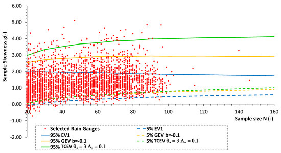 From the analysis of the abacus, it is possible to assess that: (1) the EV1 model allows for the reconstruction of sample skewness for almost 80% of cases (i.e., 2679 samples); (2) the use of the shape parameter b = −0.1 (among all the considered values) provides the best modeling with the GEV law: 88.7% of cases, equal to 2971 sample series. Moreover, 2526 series from this subset (i.e., the 75.4% of the whole data set) can be modeled with EV1; (3) the sample skewness of 3064 time series (91.4% of the entire data set) can be reconstructed through the TCEV law with = 0.1 and = 3. From this subset, the 2520 series (75.2 % of the whole data set) can be modelled with the EV1 and 2961 series (88.4% of the entire data set) with GEV distribution with b = −0.1.
