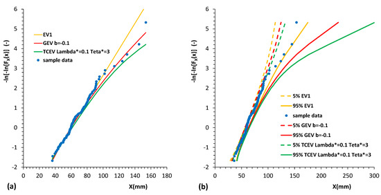 As an example of an application for a single daily AM time series, the authors focused on the Subiaco rain gauge (close to Rome), characterized by N = 103, g = 1.53, and an average of 68.8 mm with a standard deviation of 21.1 mm. The Mann–Kendall test provided a value of the statistic ZMK equal to 1.39 over the entire time series and to 1.91 if we consider the data from 2000. In both cases, the absolute value of ZMK is less than 1.96, then it is possible to not reject the hypothesis of a stationary process with a significance level of 5%. By inserting the information (N = 103, g = 1.53) on the EXSTRASTAR abacus, it emerges that Subiaco AM series can be modeled with EV1 and with GEV−b = −0.1 and TCEV− = 0.1 and = 3.