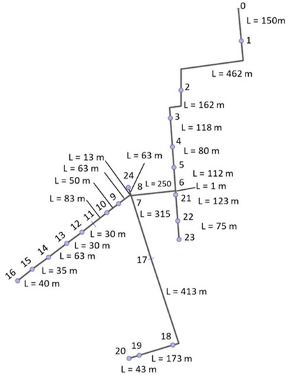 13]. The pressure at the inlet of the network, i.e., at node #0, changes during the irrigation season depending on the water demand of the other sectors of the district. In particular, it ranges between 128 and 142 m as indicated in [