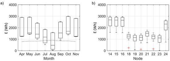 Figure 3b, the most critical nodes are those showing the lowest values of recovered energy, i.e., nodes #18, #19, #20, #22, and #23. These nodes must be equipped with a larger battery to cover energy deficit periods during the months of July and August.