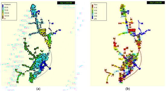 Detailed hydraulic model of the calibrated water distribution system of Laives. (a) Map of the simulated pressures and (b) map of the simulated flow rates in EPANET.