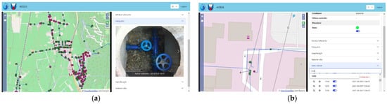 Digital Twin of the aqueduct of Laives embedded in modern web-based integrated water management software. (a) View of the network and information panel, and (b) detail of a valve element.