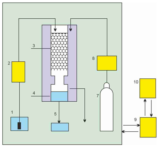 Schematic diagram of the extraction cell and the phase separator: 1, aqueous-phase reservoir; 2, aqueous-phase pump; 3, extraction column; 4, phase separator; 5, aqueous-phase restrictor; 6, CO2-rich phase restrictor; 7, CO2 cylinder; 8, liquid CO2 pump; 9, control unit; 10, PC for input and display of operating parameters [2].