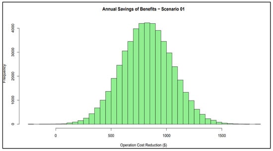 The MCS results are shown in Figure 2 and Table 4. The model that evaluated the operational costs and the proportional impact of the benefits considered a normal distribution for the annual cost reduction, which resulted in a median value of USD 821.24. The probability of achieving a saving of at least USD 440.79 was 95% and a saving of more than USD 1203.42 was 5%.