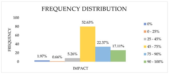 Table 1 contains the observed benefits and results from the qualitative research carried out with specialists from Australia, which was contained in the complementary documentation of the work of Monks et al. (2020), and presents all possible benefits and their economic impact percentages. Table 2 presents the assessment of the impact percentage of each of the benefits identified in the reduction of the operating costs (savings generated), with the number of expert responses by impact intervals (there are six impact percentage intervals: 0%, from 0% to 25%, from 25% to 45%, from 45% to 75%, from 75% to 90%, and from 90% to 100%). In practice, the tables are extracts from the complementary documentation in the work of Monks et al. (2020), with new calculations for the frequencies. The total frequency distribution is also shown in Figure 1, that is, considering all the benefits listed in Table 1 and Table 2.