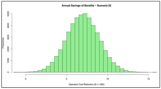 The MCS results are shown in Figure 4 and Table 8. As with the previous scenario, the model considered the operational costs, the proportional impact of the benefits, and a normal distribution for the annual cost reduction, which resulted in a median value of USD 6985.47, with a 95% probability of achieving at least a saving of at least USD 3708.43 and a 5% probability of achieving a saving of more than USD 1,025,284.43.