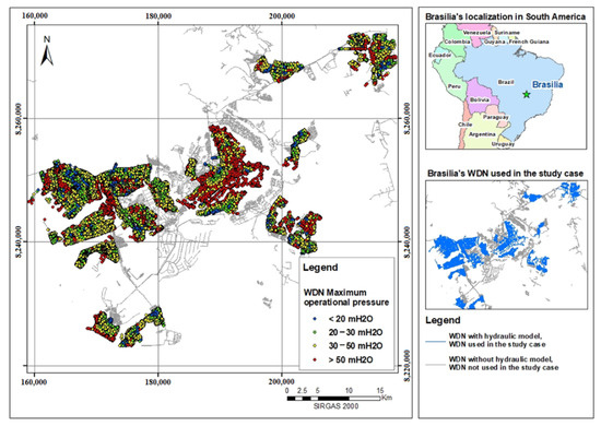 The investigation using ML to predict leaks in water service connections used data from Caesb’s WDN, the water and wastewater services provider in Brasília/Distrito Federal, the capital of Brazil. Figure 1 shows Brasília’s location and identifies the areas included in the study case; it depicts an example of operational data used, and the maximum operating pressure.