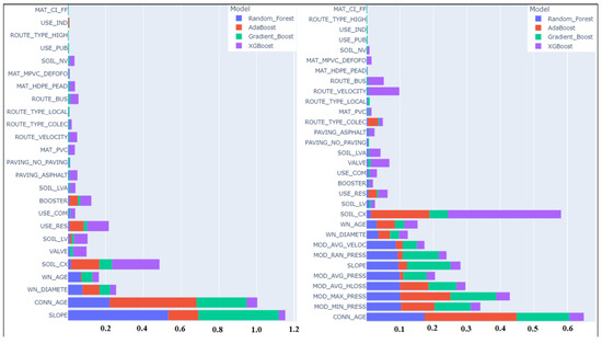 Relevance of predictor variables in a given WDN. On the left, processing without hydraulic data from the networks. On the right, results of the relevance of the variables in processing considering the hydraulic data.
