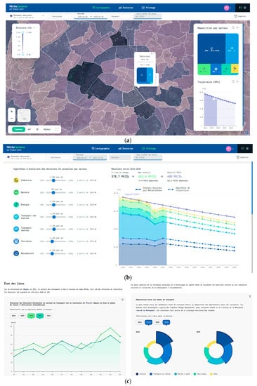 Screenshot of the CarboneDeck views and functionalities: (a) Data navigation view with map and time navigation of emissions disaggregated by sector of activity; (b) Simulation and monitoring module; (c) Dashboard of specific indicators to describe and characterize emissions from the transportation sector.