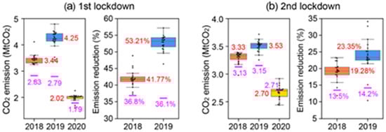 Estimates of the total fossil fuel CO2 emission budgets during the two lockdown periods over the Greater Paris region for the years 2018, 2019, and 2020: (a) First lockdown; (b) Second lockdown. Boxplots represent the statistical distribution of prior and posterior CO2 estimates, both for the absolute emission budgets and the relative emission reduction ratio. The medium values of the posterior estimates among the sensitivity tests are shown in red. The prior estimates from the Origins inventory are shown in magenta [13].