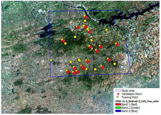 In the present study, freely available Sentinel-2 images (Level-2A product reflectance) were downloaded from the Copernicus Open Access Hub (https://scihub.copernicus.eu/ accessed on 1 June 2022), for the date 28 November 2021. This month was chosen because trees show maximum leaf and growth during this time. The data was resampled at a 10 m resolution. Based upon the above rating, healthy and non-healthy tree species’ differentiating qualities were derived from the Sentinel-2 data. Which was further used for discriminating against the non-healthy tree species using Spectral Angle Mapper (SAM). Out of 45 plots, 20 plots were kept aside for data validation.
