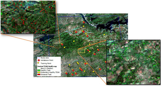 For accuracy, 20 validation plots were plotted in Tectona grandis L. health map. Out of 20 plots surveyed from ground, the accuracy of the data was founded to be 75%.