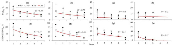 5-year dynamics of ΔT/Tbg (a–d) and ΔNDVI/NDVIbg (e,f) anomalies in post-fire plots in dominant tree stands: (a,e) Larch (Larix sibirica); (b,f) Scots pine (Pinus sylvestris); (c,g) Spruce (Abies sibirica); (d,h) Fir (Picea obovata). LS is a low degree of severity in terms of dNBR, MS is a moderate degree of severity, HS is a high degree of severity, and AT is an exponential approximation of the averaged values.