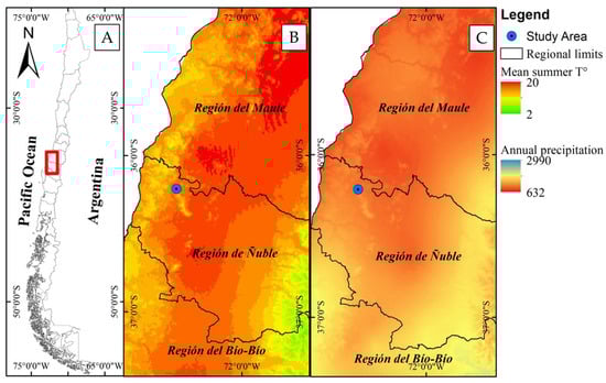 Ubication of trial in Chile (A), study area of maps of mean summer temperature (B), and annual precipitation (C).