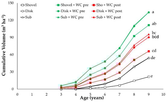 Cumulative stand volume by individual treatments over time. Different lowercase letters to right side of the lines of each treatment represent the significant differences among treatments (Tukey's Honestly Significant Difference (HSD) test, p value < 0.05).