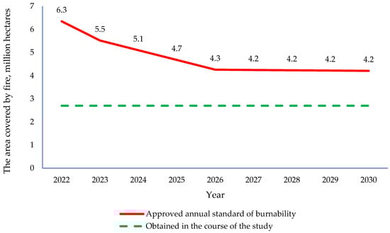 Taking into account the problems with forest fires in the Russian Federation, the President of Russia set an ambitious task to reduce the area of fires by half by 2030. To implement this task, the volume of annual funding has increased significantly (by two times). Within the framework of this instruction, the Government of the Russian Federation approved the standard of permissible area of forest fires for each region, and if exceeded, the organization of forest protection from fires will be considered unsatisfactory (Figure 1). As a basis, a simplified approach was chosen to reduce the area inversely proportional to the increase in financing.