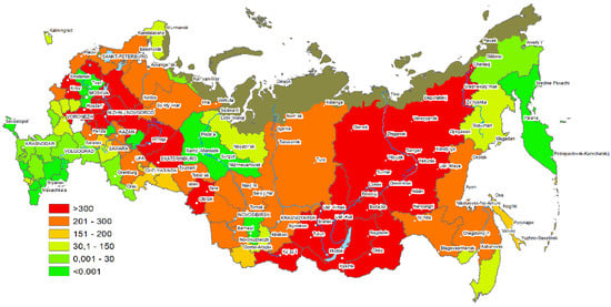 As a result of the calculations carried out, an area of annual burning of 2,747,063 hectares was obtained for the entire forest land area of the Russian Federation. Among all regions of Russia, the Republic of Sakha (Yakutia) has the largest area of the permissible norm of burnability—876,261 hectares; the Krasnoyarsk Territory—389,121 hectares; and the Irkutsk Region—240,927 hectares.