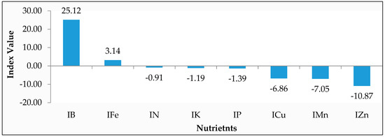 DRIS norms, descriptive data and analysis of variance showed significant differences for boron and zinc contents, while the rest of the nutrient concentration as well as ratios remained statistically at par for high- and low-yielding populations (Table 1 and Figure 2). According to nutrient indexing of the DRIS model, boron and iron contents were sufficient in olive trees while nitrogen, phosphorus, potassium, zinc, copper, and manganese contents were moderate to highly deficient with zinc being the most deficient nutrient. Many studies have reported variations in the growth and yield of olive trees in response to their nutrient variations. These results are confirmed by [7] who reported that Arbequina showed higher growth and yield as compared to other olive cultivars as it was able to absorb more nutrients from the soil even under supersensitive conditions. In addition, [8] also reported results in favor of the present study and found that olive cultivars, especially Arbequina, were found to be more productive according to DRIS norms in long-term studies as compared to the studies that continued for shorter periods.