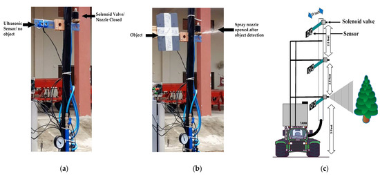 The spot-specific sprayer with three solenoid valves and three ultrasonic sensors on a single boom is shown in Figure 1c. This system can be attached to any tractor or small farm vehicle. The ultrasonic sensor will detect the trees, and nozzles attached to the solenoid valves will spray whenever the trees are in the sensing range. Three sensors are attached to 10 feet boom at the height of the citrus tree. If the tree’s height is 3 feet, then only the bottom nozzle will start spraying; if the height is 6 feet, then the bottom and middle nozzle will start spraying; and if the tree’s height is 9 feet tall, then all three nozzles will start spraying.