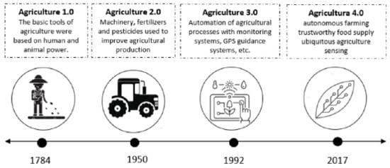 Agriculture is the main source of survival for all living beings on Earth. The systemic production of crop plants via the integration of modern technological advancements can mitigate the upcoming disasters of food security and hunger risk. The technological integration of smart agriculture, precision agriculture, 5G, and IoT can boost farm practices at the level of automation that can transform a decision-support system to optimize operations [1]. The evolutionary period of agriculture has reached the level of digital agriculture, named as “Agriculture 4.0” or digital agriculture (Figure 1) [2]. Developing countries are lacking in the adaptation of digital agriculture due to their limited sources.
