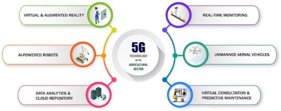 Cellular communications and internet connectivity for modern times require fast services for heavy files of data transfer with high speed. These targets are now made possible to achieve by the modern fifth-generation (5G) networks, with the characteristics of achieving universal connectivity, minimum latency, and, specifically, with the highest rate of data transfer [3]. Although the technology is moving towards the next phase of the novel state-of-the-art sixth-generation (6G) network, currently, the global system is running on 5G. The IoT is completely dependent on the availability of interconnected devices that can collect, analyze, and transfer data in real time. The use of IoT in agriculture is advancing rapidly with the advent of 5G because IoT devices can perform long-range operations rapidly and reliably. Thus, 5G technology in the agricultural sector has put its greater influence in real-time monitoring, unmanned aerial vehicles, virtual consultation and predictive maintenance, artificially intelligent robotics, and data analytics and cloud repositories (Figure 2) [4].