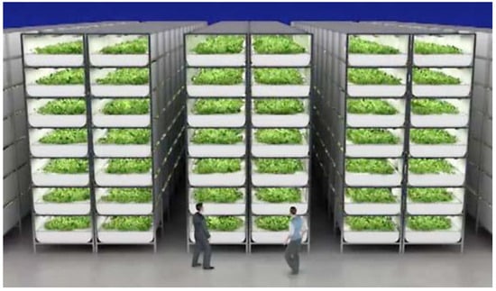 Vertical farming practices do not require soil particularly, so plantation can go in an upwards direction in the form of layers and sometimes reach up to multistory levels (Figure 1) []. There are several types of vertical farming but three of them are commonly used soil-less methods including hydroponic, aeroponic, and aquaponic. Hydroponic farming is the technique of growing plants in water. The nutrients are continuously monitored and are provided only in calculated amounts. Aeroponic farming systems do not even need a water medium to grow plants. This system only uses a mist or spray of nutrients in the root growth chamber. Aeroponic farming can even save up to 90% of the water as compared to hydroponic. Aquaponic systems are only used for fast-growing crops because this system combines hydroponic farming and fish farming at the same time. Fish growth is reliant on nutrients and fish farming waste, rich in nutrients, is used as a recycling component for plant growth which results in economically viable and efficient plant growth [].